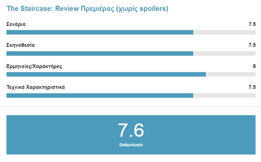 Τελική Ετυμηγορία: Το The Staircase είναι μια δραματοποιημένη εκδοχή ενός docuseries μιας αληθινής ιστορίας. Στη πρεμιέρα δεν είδαμε κάτι διαφορετικό από τα ήδη γνωστά συμβάντα, αλλά υπάρχουν περιθώρια βελτίωσης. Ωστόσο, αναμφίβολα οι ερμηνείες του καστ και κυρίως του Colin Firth ξεχωρίζουν. Μένει να δούμε πώς θα εξελιχθεί η σειρά στα υπόλοιπα 5 μονόωρα επεισόδια της.