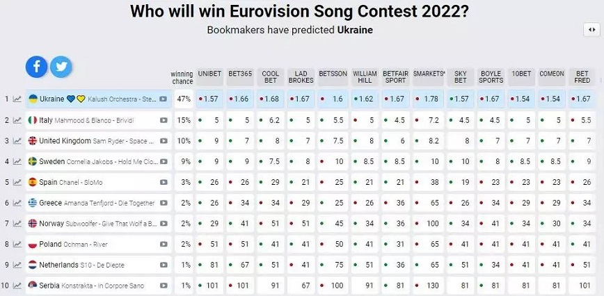 Μάλιστα, έχει σχεδόν τα ίδια ποσοστά με την Πολωνία για νίκη στο τελικό της Eurovision, που θα πραγματοποιηθεί το Σάββατο 14 Μαΐου.