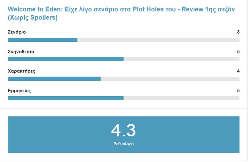 Ενώ η σειρά μας καλωσορίζει στην Εδέμ δεν μπορώ να πω πως ένιωσα ευπρόσδεκτος βλέποντας αυτήν την σειρά. Υπάρχει μια σεναριακή ρηχότητα που απλά δεν σου επιτρέπει να εστιάσεις σε τίποτα θετικό που μπορεί να βρεις στην σειρά, αν και γενικά δεν είναι πολλά. Καταφέρνει ως ένα βαθμό να κρατήσει ένα μυστήριο σχετικά με το νησί αλλά με έναν μαγικό τρόπο το κάνει τόσο αδιάφορο και σε κάνει να αναρωτιέσαι αν αξίζει ο χρόνος σου καθώς το βλέπεις.