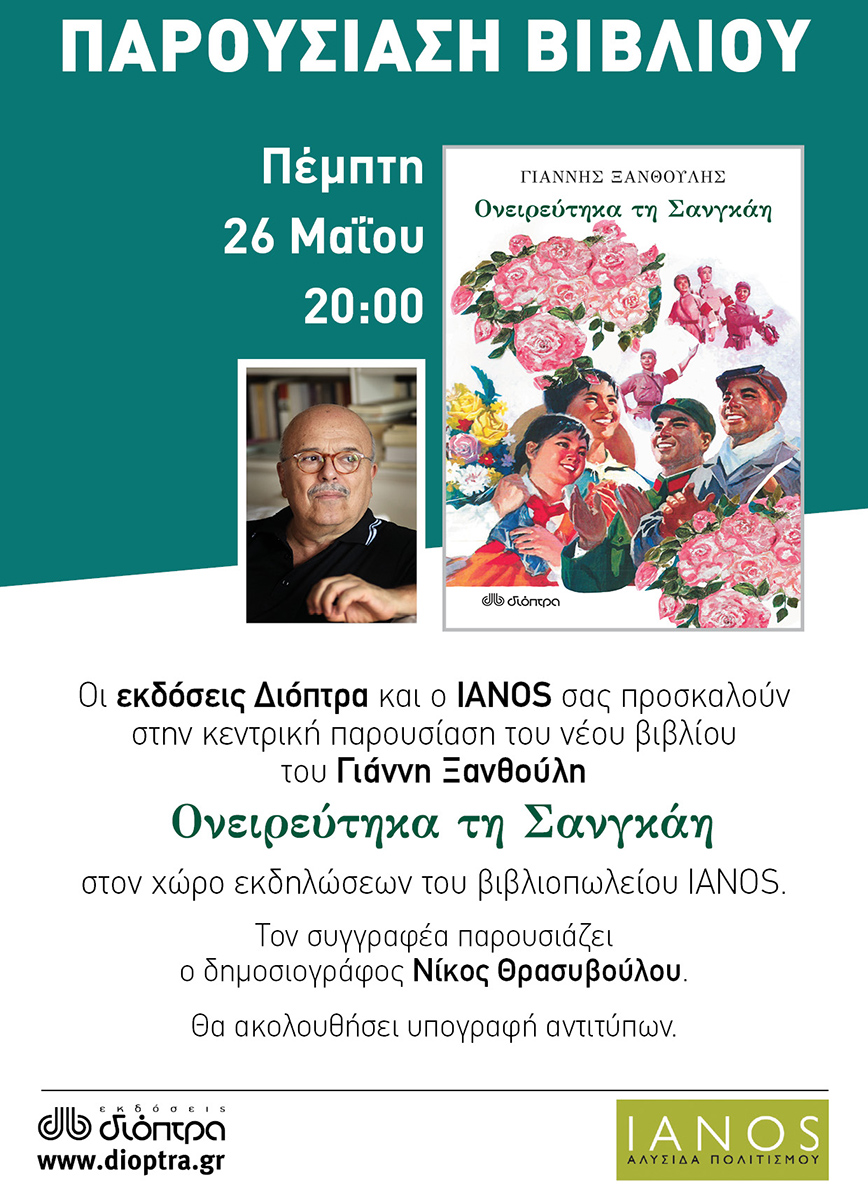 Οι εκδόσεις Διόπτρα και ο IANOS σας προσκαλούν στην κεντρική παρουσίαση του νέου βιβλίου του αγαπημένου συγγραφέα Γιάννη Ξανθούλη, Ονειρεύτηκα τη Σανγκάη, στον χώρο εκδηλώσεων του βιβλιοπωλείου IANOS.