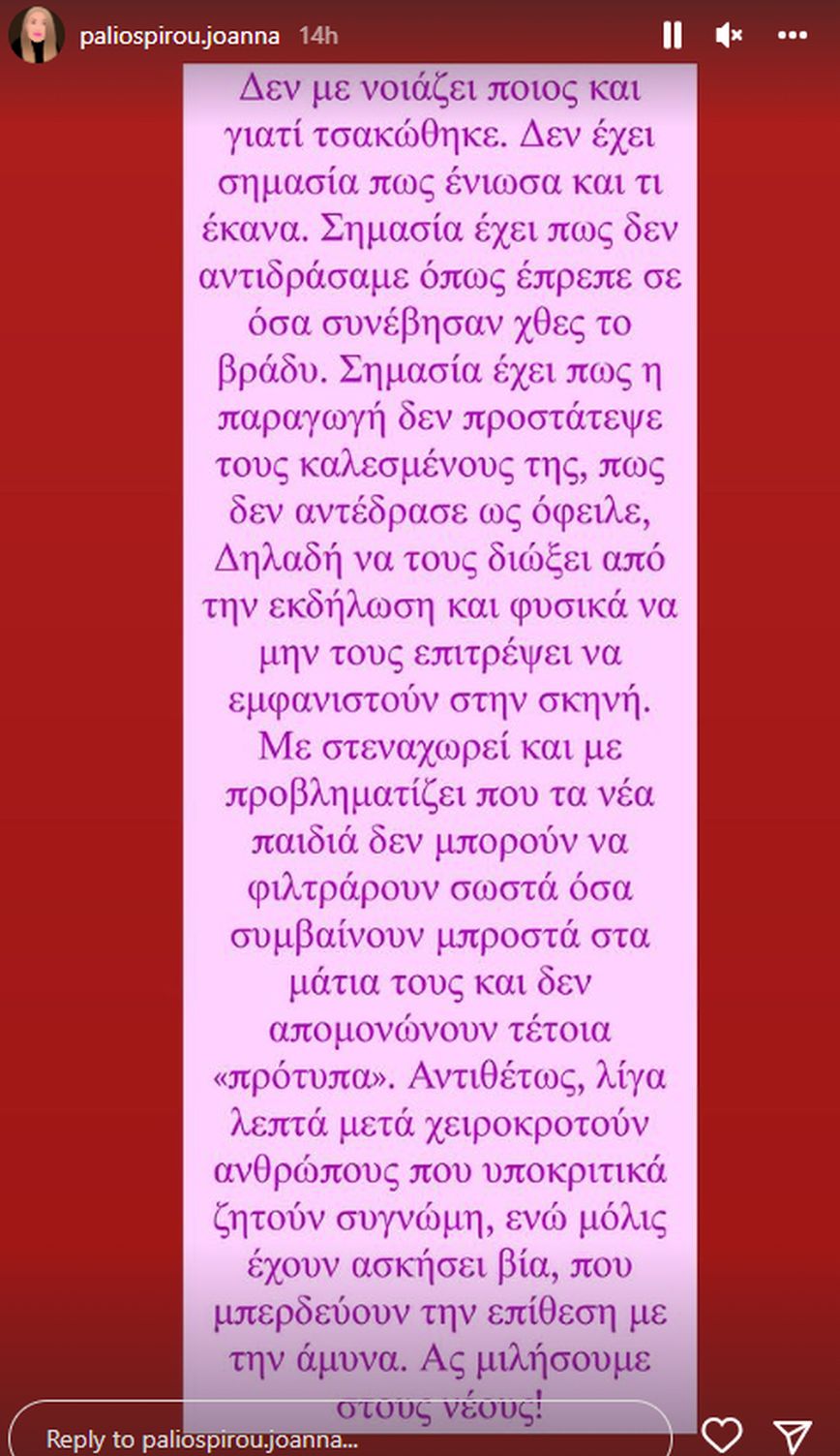 H Ιωάννα Παλιοσπύρου, η οποία ήταν στη σκηνή για να δώσει και το βραβείο στην Έλενα Παπαρίζου, κάτι που τελικά δεν έγινε, έγραψε: «Δεν με νοιάζει ποιος και γιατί τσακώθηκε. Δεν έχει σημασία πώς ένιωσα και τι έκανα. Σημασία έχει πως δεν αντιδράσαμε όπως έπρεπε σε όσα συνέβησαν χθες το βράδυ. Σημασία έχει πως η παραγωγή δεν προστάτευσε τους καλεσμένους της, πως δεν αντέδρασε ως όφειλε. Δηλαδή να τους διώξει από την εκδήλωση και φυσικά να μην τους επιτρέψει να εμφανιστούν στη σκηνή. Με στενοχωρεί και με προβληματίζει που τα νέα παιδιά δεν μπορούν να φιλτράρουν σωστά όσα συμβαίνουν μπροστά στα μάτια τους και δεν απομονώνουν τέτοια «πρότυπα». Αντιθέτως, λίγα λεπτά μετά χειροκροτούν ανθρώπους που υποκριτικά ζητούν συγγνώμη, ενώ μόλις έχουν ασκήσει βία, που μπερδεύουν την επίθεση με την άμυνα. Ας μιλήσουμε στους νέους».