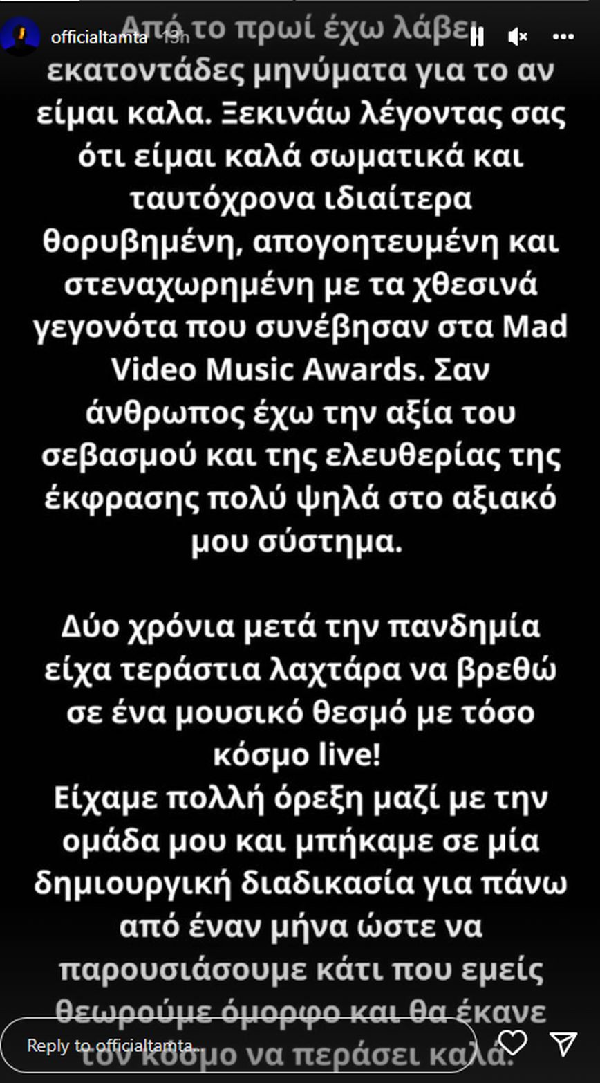 Και η Τάμτα, η οποία ήταν στα μουσικά βραβεία, σχολίασε όσα έγιναν: «Από το πρωί έχω λάβει εκατοντάδες μηνύματα για το αν είμαι καλά. Ξεκινάω λέγοντάς σας ότι είμαι καλά σωματικά και ταυτόχρονα ιδιαίτερα θορυβημένη, απογοητευμένη και στεναχωρημένη με τα χθεσινά γεγονότα που συνέβησαν στα MAD VMA. Σαν άνθρωπος έχω την αξία του σεβασμού και της ελευθερίας της έκφρασης πολύ ψηλά στο αξιακό μου σύστημα.