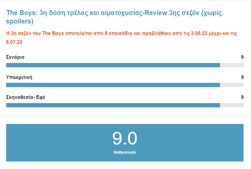 Η 3η σεζόν του The Boys αποτελεί ένα ευχάριστο διάλειμμα από τον κόσμο της Marvel με την σειρά να συνεχίζει να πειραματίζεται και να τεστάρει τα όρια του κοινού, με τον Homelander να παραδίδει μαθήματα τρέλας και κακίας. Η σειρά έδωσε περισσότερο βάθος σε χαρακτήρες όπως ο Frenchie, o Butcher και η Kimiko ενώ συνέχισε να κάνει αναφορές και σε σοβαρά θέματα όπως το BLM, Antifa και σεξισμό. Η 3η σεζόν τα είχε όλα και δικαίως ανανεώθηκε για 4η σεζόν.