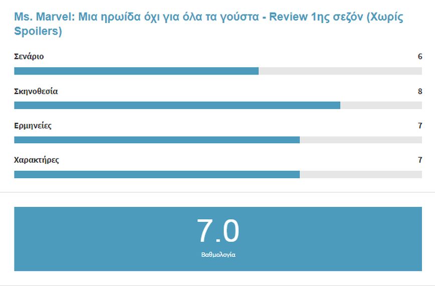 Η προσθήκη της Ms.Marvel στο MCU είναι σίγουρα ένα στοιχείο που θα αλλάξει ξανά τα δεδομένα του ηρωικού αυτού σύμπαντος ωστόσο ίσως να μην έγινε και με τον πιο σωστά δομημένο τρόπο. Η σειρά κατάφερε να προσφέρει κάτι φρέσκο και νεανικό στο MCU που σίγουρα έλειπε, είχε όμως και αρκετές αδυναμίες και μια από αυτές ήταν ο ρυθμος με τον οποίο εξελίχθηκε η ιστορία αλλά και ο αριθμός των επεισοδίων. Τα μόλις 6 επεισόδια φαίνεται να μην είναι αρκετά με το συγκεκριμένο μοτίβο αφήγησης που χρησιμοποιήθηκε. Στα πρώτα επεισόδια έχουμε μια μεγάλη εισαγωγή στον κόσμο της Kamala και όλα κινούνται αρκετά αργά με την ίδια να πρέπει να ανακαλύψει τις δυνάμεις της και όχι μόνο. Καθώς όμως φτάνουμε στο τέλος όλα αλλάζουν πολύ γρήγορα και στην προσπάθεια να δοθούν εξηγήσεις κάποια θέματα ή ιστορίες ίσως περάσουν απαρατήρητα.
