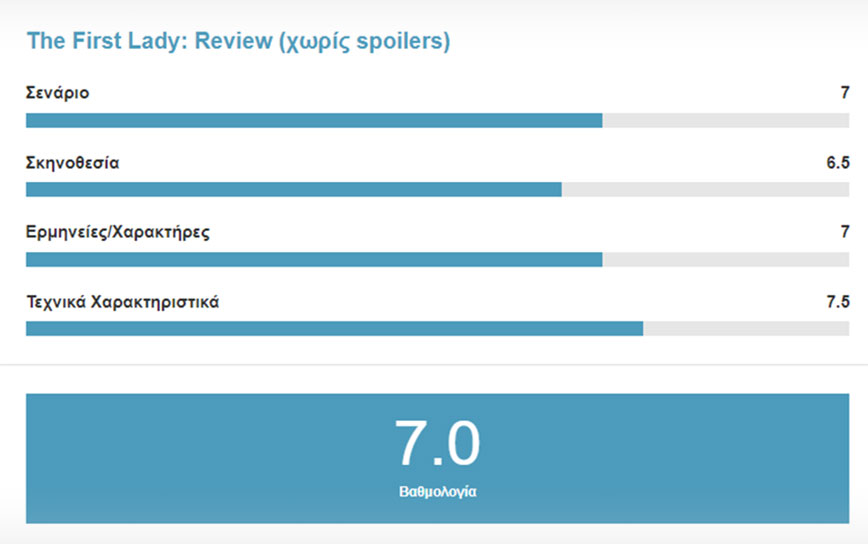 Tελική Ετυμηγορία: Το First Lady έχει μια ενδιαφέρουσα πλοκή και ένα all star cast, κριτήρια αρκετά δυνατά για ένα συναρπαστικό αποτέλεσμα. Δυστυχώς όμως ενώ είχε τις δυνατότητες, κάπου στη πορεία το έχασε…. Η σειρά στην χώρα μας προβάλλεται από την COSMOTE TV.
