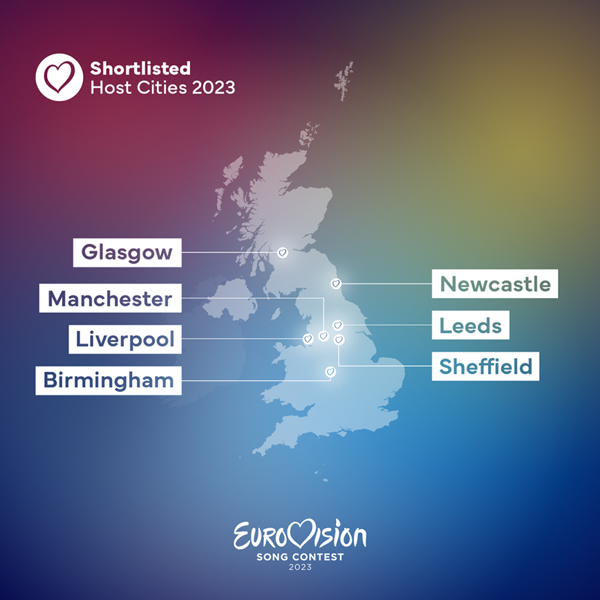 Στο Ηνωμένο Βασίλειο θα πραγματοποιηθεί ο διαγωνισμός της Eurovision 2023 και σήμερα, μέσω του BBC, η EBU (European Broadcasting Union) ανακοίνωσε τις πόλεις που διεκδικούν τη φιλοξενία του διαγωνισμού.