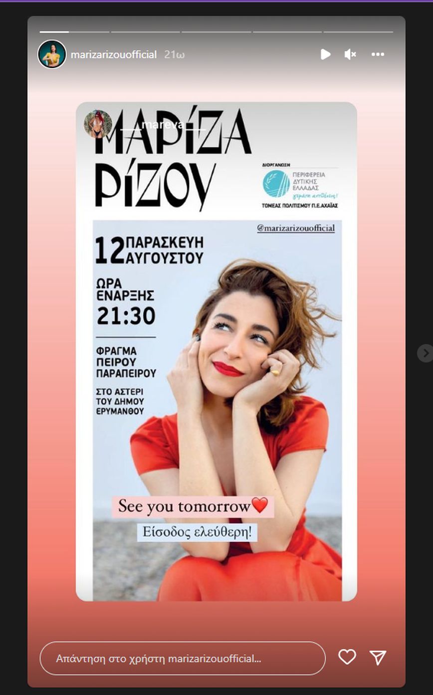Η Μαρίζα Ρίζου μέσω ενός instastory που δημοσίευσε πριν λίγη ώρα στον προσωπικό της λογαριασμο στο Instagram ενημέρωσε τους διαδικτυακούς της φίλους, πως η συναυλία θα πραγματοποιηθεί στις 05 Σεπτεμβρίου.
