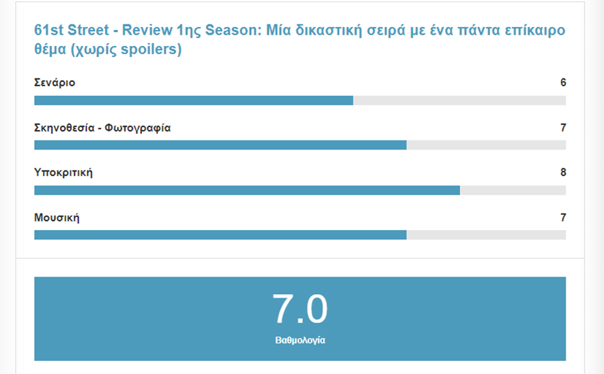 Από την στιγμή που είδα πως παραγωγός θα είναι ο Peter Moffat του «The Night Of» και «Your Honor», σίγουρα μόνο καλό αποτέλεσμα περίμενα. Το «61st Street» είναι μία βαριά δραματική κοινωνική και με έντονο το δικαστικό στοιχείο σειρά που κυριαρχεί το ταλέντο των ηθοποιών.