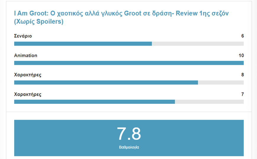 Δεν ξέρω τι μπορεί να περίμενε κανείς από το «I Am Groot» μέσα σε 5 επεισόδια που δεν ξεπερνούν τα 5 λεπτά και έναν ήρωα που απλά μας συστήνεται σε λούπα, αλλά αν εξαιρέσουμε τις προσωπικές προσδοκίες του καθένα μας η σειρά απλά θα σας διασκεδάσει με ένα πολύ ευχάριστο binge watching που μπορεί και να σας ξαφνιάσει σε ορισμένα σημεία.