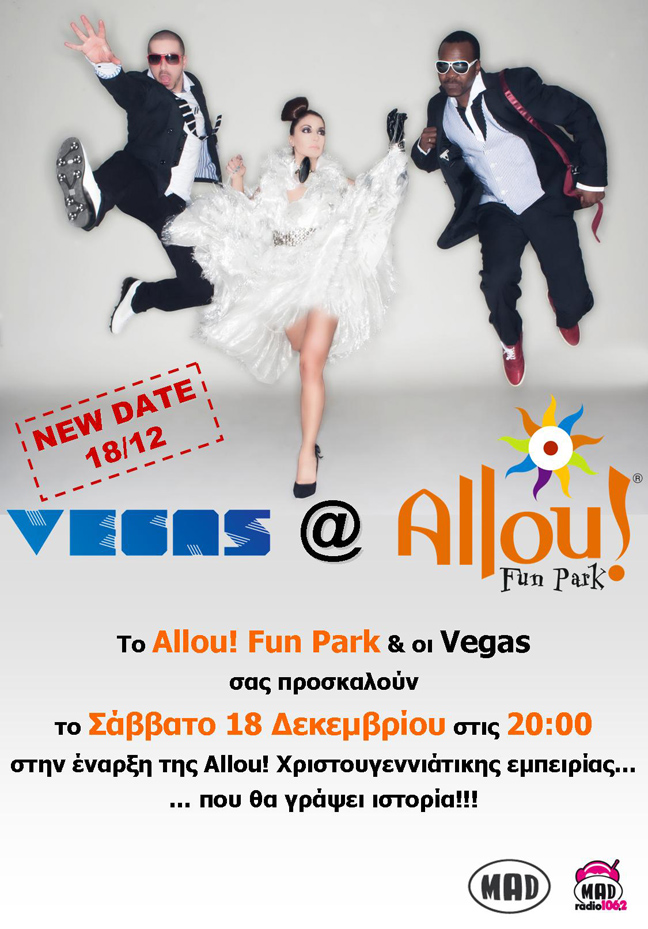 VEGAS το αγαπημένο συγκρότημα των νέων θα ξεσηκώσει τους επισκέπτες του Allou! Fun Park με ένα μοναδικό και άκρως Χριστουγεννιάτικο Live show. Οι VEGAS όχι μόνο θα τραγουδήσουν όλες τους τις επιτυχίες αλλά, μαζί με όλους τους fans θα ανάψουν τα χιλιάδες πολύχρωμα χριστουγεννιάτικα φωτάκια σε όλο το Πάρκο, εγκαινιάζοντας επίσημα την χριστουγεννιάτικη περίοδο του Allou! Fun Park.