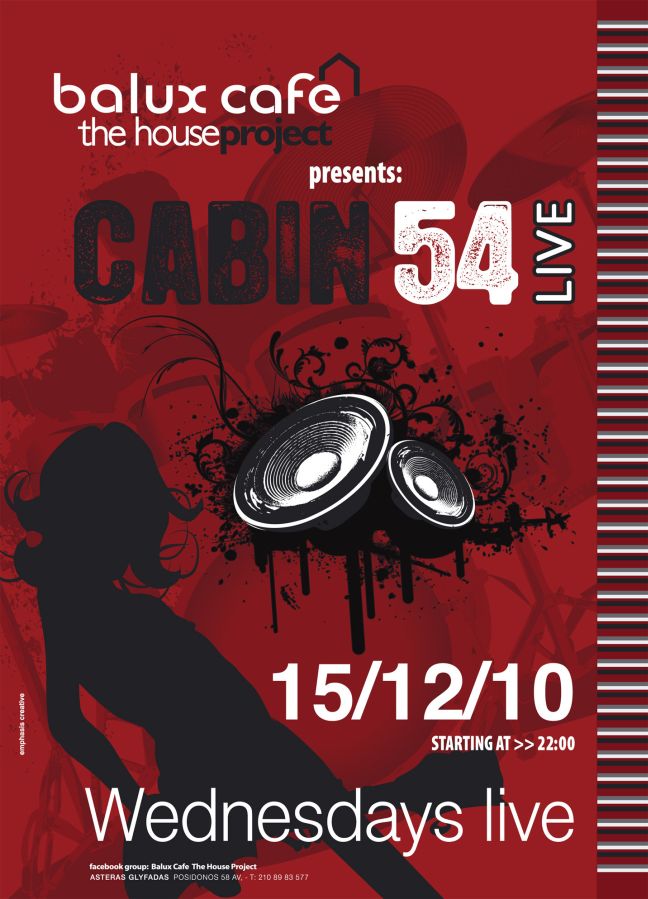 Αυτήν την Τετάρτη 15 Δεκεμβρίου μπορείτε να απολαύσετε τους Cabin 54 σε γνωστές ξένες ροκ διασκευές στο χώρο που φιλοξενεί τα πιο «ψαγμένα» live στην περιοχή της Γλυφάδας. Το Balux Café The House Project κάθε βδομάδα σας προτείνει κάτι διαφορετικό!