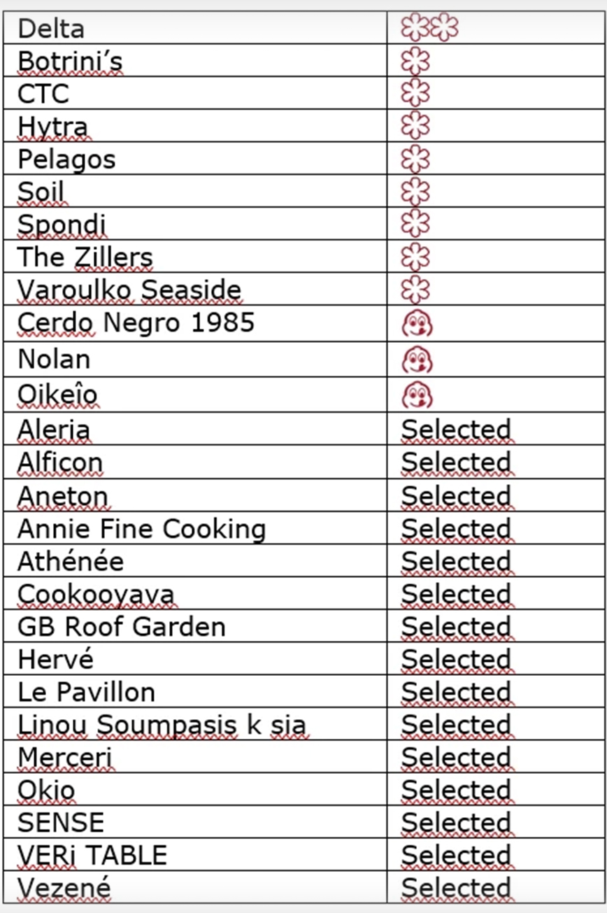 27 εστιατόρια επιλέχτηκαν που περιλαμβάνουν: