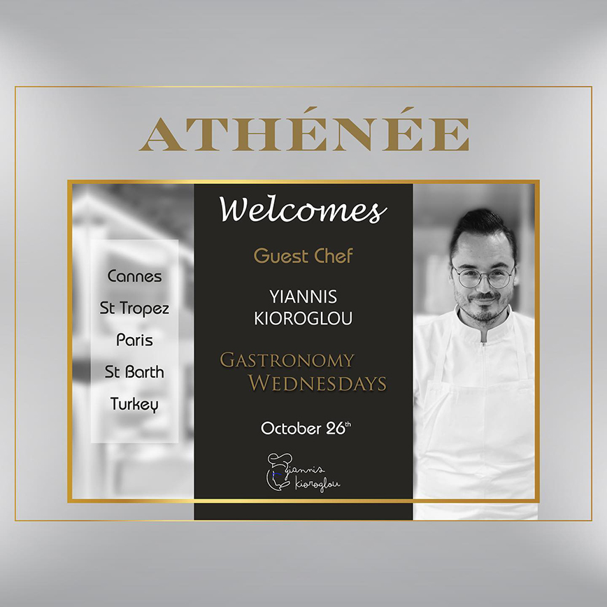 Τo Athénée συνεχίζει τις επιτυχημένες βραδιές γαστρονομίας, προσκαλώντας καταξιωμένους Έλληνες και διεθνείς chefs να μαγειρέψουν για μία και μοναδική βραδιά ένα special μενού. Επόμενος καλεσμένος τωv «Gastronomy Wednesdays» την Τετάρτη 26 Οκτωβρίου είναι ο Γιάννης Κιόρογλου, Chef μεταξύ άλλων του φημισμένου κοσμοπολίτικου εστιατορίου «La Guérite» στις Κάννες.