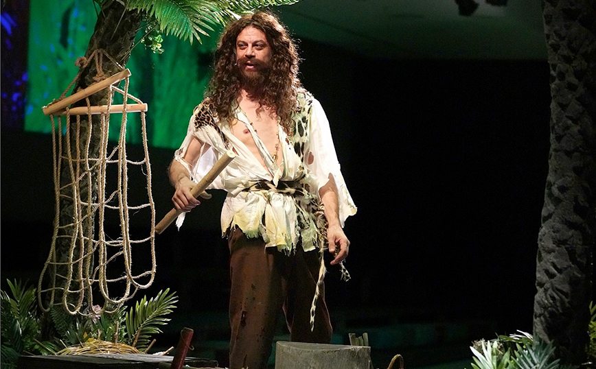 Στη μουσικοθεατρική μεταφορά του έργου για το Μέγαρο Μουσικής Αθηνών, η ευφάνταστη διασκευή του Γιώργου Γαλίτη έχει χιούμορ, αναφορές σημερινές και λόγο σύγχρονο. Διανθίζεται με πολλά και διαφορετικά μουσικά ακούσματα σε πρωτότυπη μουσική σύνθεση του Μηνά Αλεξιάδη, με ορχήστρα επί σκηνής και τραγούδια που μεταφέρουν με ευχάριστο και ψυχαγωγικό τρόπο διαχρονικά μηνύματα από τον πολυμελή θίασο. Οι εντυπωσιακές προβολές μαζί με τα σκηνικά και τα κοστούμια μάς μεταφέρουν στην εποχή και το ερημικό περιβάλλον του “Νησιού της Απόγνωσης”, όπως ονομάζει ο αγαπημένος ήρωας το μικρό νησί του και απογειώνουν το αισθητικό αποτέλεσμα.