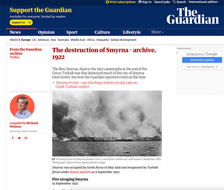 Όπως αναφέρει η τουρκική εφημερίδα Hurriyet, η Ελλάδα «στα 100 χρόνια από την απελευθέρωση της Σμύρνης προπαγανδίζει τα ιστορικά γεγονότα κατά της Τουρκίας». Ο τίτλος του κειμένου μάλιστα είναι: «Παγκόσμιο φιλμ του εισβολέα – Ελληνική προπαγάνδα σε 100 κινηματογράφους των Ηνωμένων Πολιτειών».