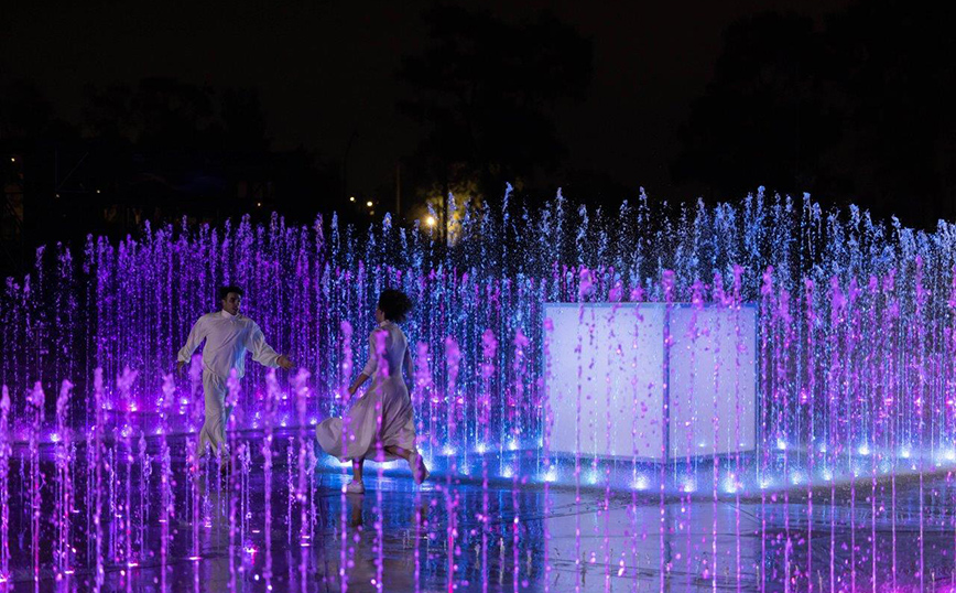 Η λαμπερή βραδιά ξεκίνησε στο Σιντριβάνι, με ένα show γεμάτο φαντασία, χορό και μουσική, συνοδεία 12μελούς ορχήστρας, υπό τη διεύθυνση του Ανδρέα Τσελίκα. Ένα ζευγάρι, χορεύοντας με το νερό και το φως, μεταμόρφωσε με την ενέργειά του το Πάρκο, σε ένα παραμυθένιο σκηνικό στις αποχρώσεις του μπλε και του μωβ.