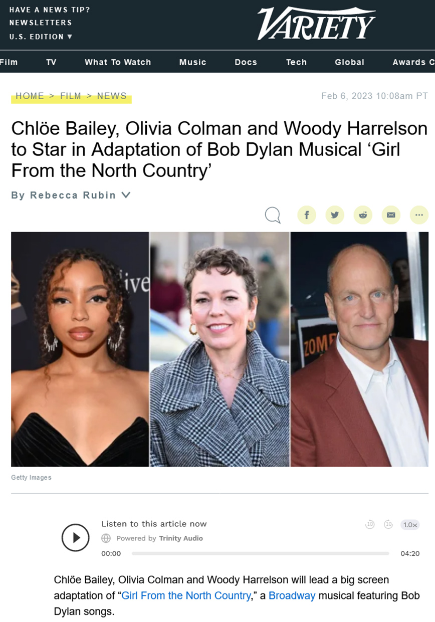 Η Κλόι Μπέιλι, από το R&B ντουέτο Chloe x Halle, η Ολίβια Κόλμαν και τον Γούντι Χάρελσον θα πρωταγωνιστήσουν στην επερχόμενη κινηματογραφική μεταφορά του μιούζικαλ του θεατρικού συγγραφέα, Κόνορ ΜακΦέρσον «Girl From The North Country», το οποίο βασίζεται στα τραγούδια του Μπομπ Ντίλαν. Ο ΜακΦέρσον θα γράψει το σενάριο και θα σκηνοθετήσει την ταινία παραγωγής της Blueprint Pictures.