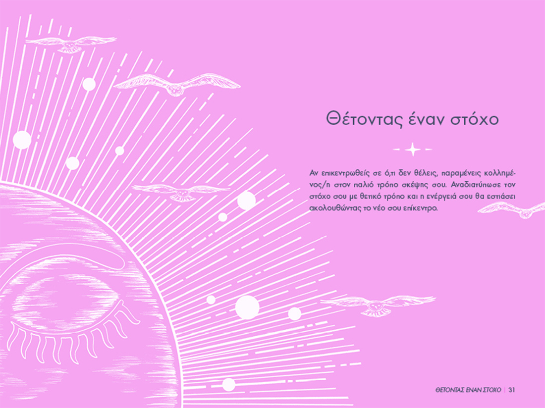 Θα μάθεις πώς να αναδιατυπώνεις τους στόχους σου με σαφήνεια κι επίγνωση. Θα σε βοηθήσει να έχεις μεγαλύτερο έλεγχο στη σκέψη, αλλά και στα συναισθήματά σου. Θα σε ωθήσει σε μια πιο θετική στάση ζωής, όπου δεν θα εναποθέσεις μαγικά τις ελπίδες σου στο σύμπαν, αλλά θα μάθεις να συνεργάζεσαι μαζί του, κατανοώντας τον τρόπο που λειτουργεί και βρίσκοντας τη θέση σου μέσα σε αυτό. Με σύμμαχό σου τη φύση, θα αφεθείς στο να εμπιστεύεσαι καλύτερα το ένστικτό σου και θα αρχίσεις να ακούς πιο δυνατά και ξεκάθαρα την εσωτερική σου φωνή και τις βαθύτερες σκέψεις σου.