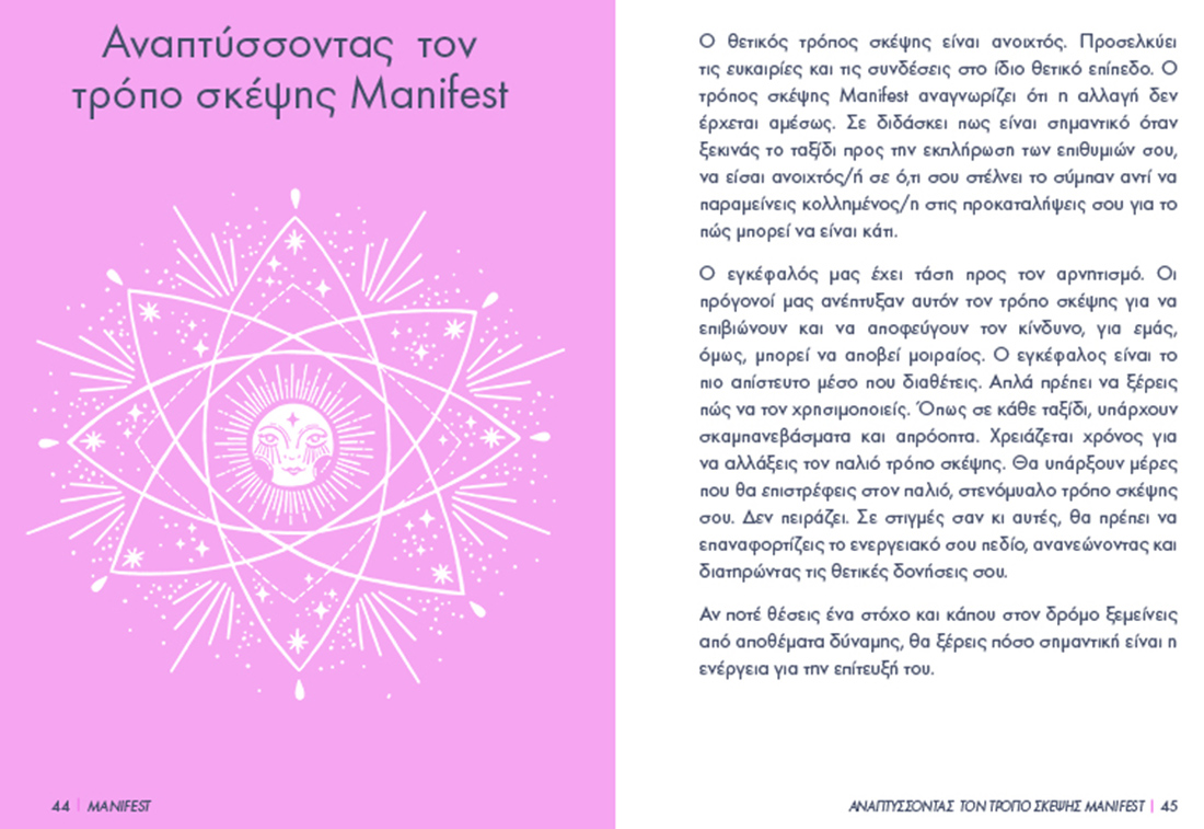 Στο Manifest θα ανακαλύψεις πρακτικές που έρχονται από τα βάθη της ιστορίας και ταιριάζουν στις σύγχρονες ανάγκες σου με έναν καθησυχαστικό κι αρμονικό τρόπο. Δε θα χάσεις την ώρα σου με μαγικά τρικ και μεταφυσικές επικλήσεις, ξόρκια ή γητειές. Θα μυηθείς σε μια μέθοδο που σε ωθεί να έρθεις πιο κοντά στον εαυτό σου, ξεκλειδώνοντας τη συνειδητότητα και την αυτογνωσία. Σε βάζει στη διαδικασία να σκεφτείς πώς λειτουργεί το σύμπαν και σε κάνει να δεις και να σκεφτείς τι θες από τη ζωή σου. Σε φέρνει αντιμέτωπο με τις επιθυμίες, τις ανάγκες και τους στόχους σου.