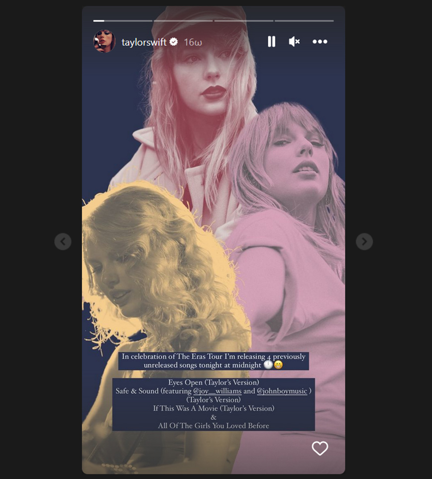 «Στο πλαίσιο του εορτασμού της περιοδείας The Eras, θα κυκλοφορήσω 4 τραγούδια που δεν είχαν κυκλοφορήσει στο παρελθόν απόψε τα μεσάνυχτα», έγραψε στο story της.