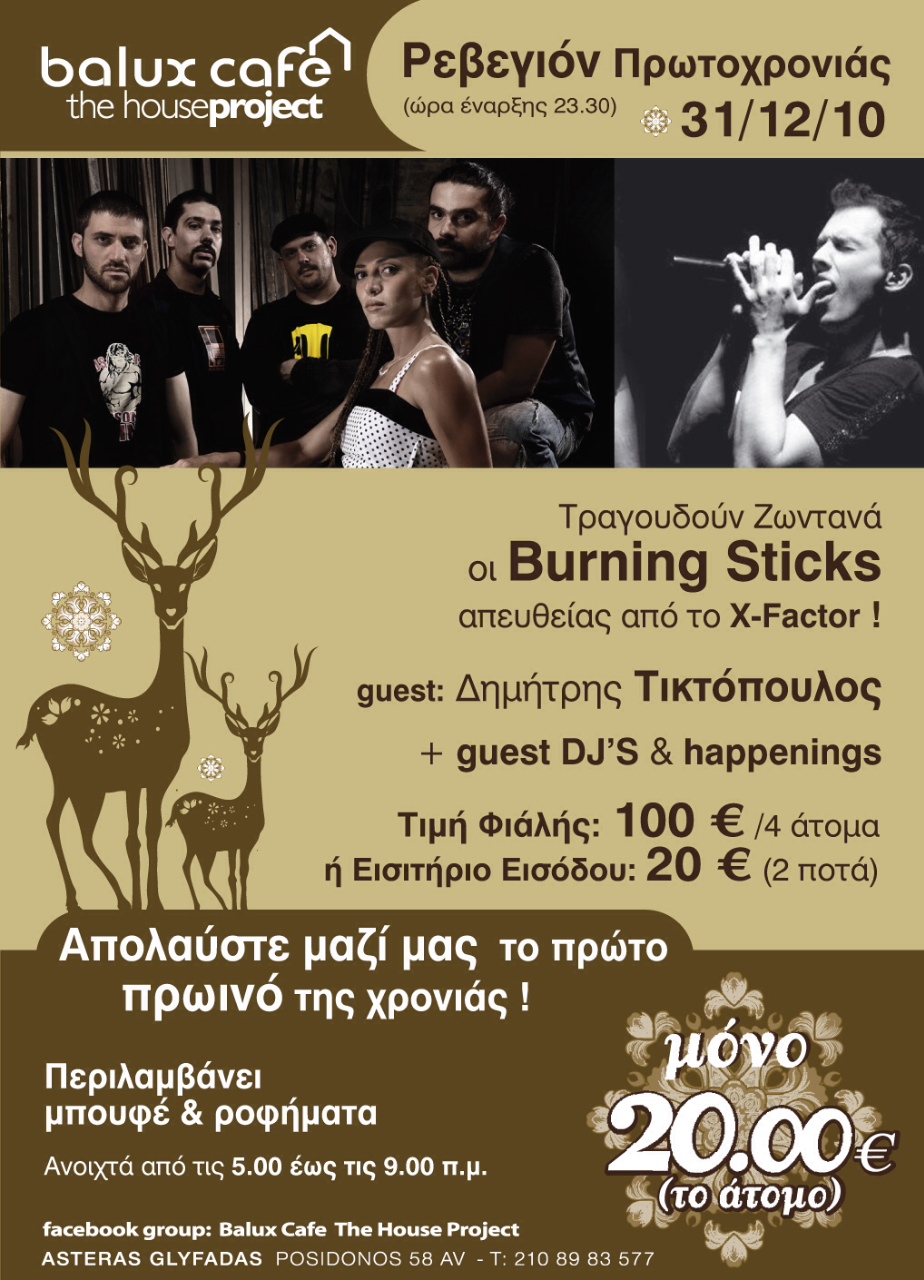 Τους γνωρίσαμε και τους αγαπήσαμε στη σκηνή του X-Factor. Οι Burning Sticks σας προσκαλούν σε ένα διαφορετικό ρεβεγιόν πρωτοχρονιάς στο Balux Café The House Project την Παρασκευή 31/12 στις 23:30 με πλούσιο πρόγραμμα, guest dj’s και πολλά happenings.