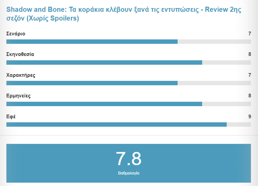 Το Shadow and Bone είναι σίγουρα μια παραγωγή του Netflix ιδανική για τους λάτρεις των σειρών φαντασίας. Παρουσιάζει μια καλή πλοκή και σίγουρα κρύβει έναν ακόμη καλύτερο κόσμο πίσω του που μελλοντικά ίσως εξερευνήσουμε. Η 2η σεζόν καταφέρνει να πει μια καλύτερη για εμένα ιστορία η οποία φυσικά δεν είναι αψεγάδιαστη. Μεγάλο αρνητικό της σειράς είναι ότι δεν έχω καταφέρει να δεθώ προσωπικά καθόλου με την Alina. Η παρουσία της αλλά και η ιστορία της με αφήνουν οριακά αδιάφορο, η ιστορία της με τον Mal είναι εξίσου χλιαρή ενώ σε πολλά σημεία δεν περνάνε την έντονη αγάπη τους στον θεατή. Γενικά η ιστορία τους είναι κάπως αναμενόμενη με μικρές ανατροπές που δυστυχώς δεν κάνουν την διάφορα, ακόμη και αν τους πάρω μεμονωμένα σαν χαρακτήρες νιώθω πως η ανάπτυξη τους δεν είναι τόσο δημιουργική ή πρωτότυπη.