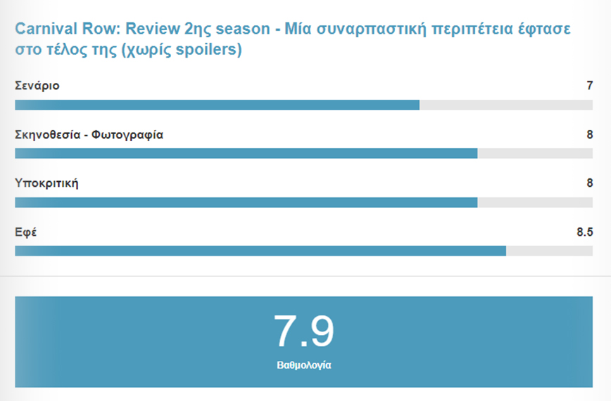 Παρόλο που η πλοκή είναι ενδιαφέρουσα και περιέχει πολλά από τα στοιχεία που έκαναν την πρώτη σεζόν τόσο δημοφιλή, η δεύτερη σεζόν είναι κάπως κατώτερη θα λέγαμε με την προηγούμενη. Παρ’ όλα αυτά, οι φαν της σειράς θα βρουν πολλά να απολαύσουν στη δεύτερη σεζόν του Carnival Row, καθώς η σειρά συνεχίζει να προσφέρει μια ενδιαφέρουσα και περιπετειώδη ιστορία σε έναν μαγευτικό κόσμο. Ίσως αν η πορεία και η κατάληξη της να ήταν διαφορετικά, να μιλούσαμε για μία από τις πιο αξιόλογες πρωτότυπες σειρές φαντασίας.