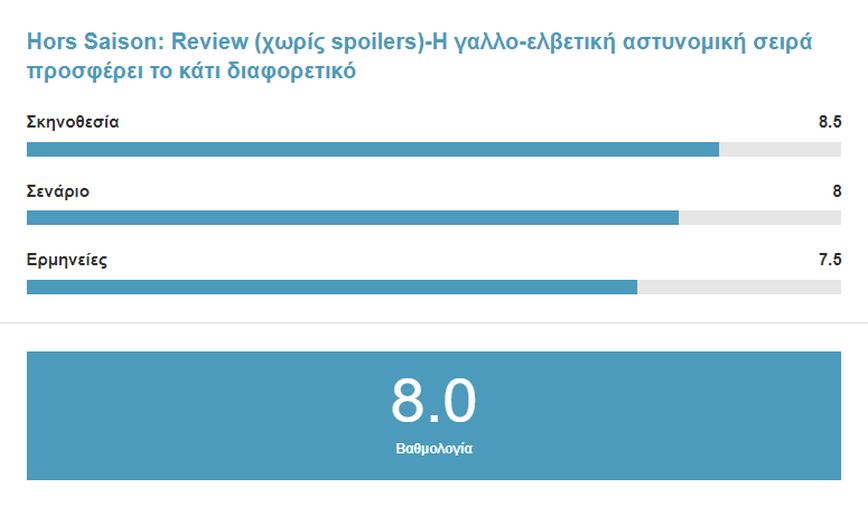 Ένα από τα απαραίτητα συστατικά των αστυνομικών σειρών είναι να κρατούν αμείωτο το ενδιαφέρον του τηλεθεατή με συνεχείς ανατροπές. Οι περισσότερες όμως, συχνά πέφτουν συχνά στην παγίδα των πολλών κλισέ του είδους και δεν διαφέρουν μεταξύ τους. Η σειρά όμως «Hors Saison» ξεφεύγει από αυτή την παγίδα και ανταμείβει τους τηλεθεατές.