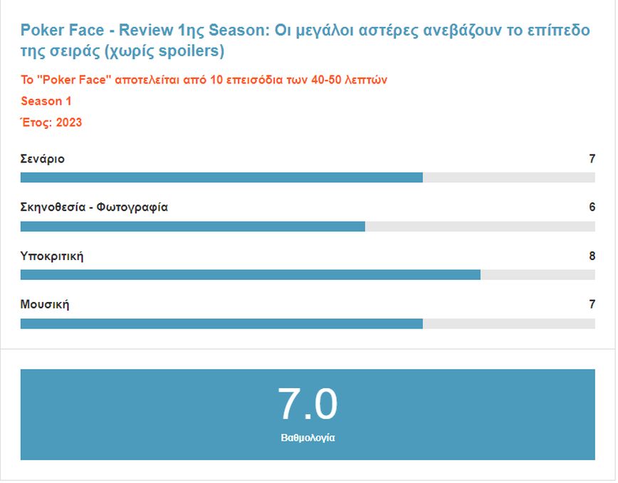 Η σειρά δεν είναι απαραίτητα φτιαγμένη για binge watching και με ένα φινάλε που έκλεισε ανοιχτά μέτωπα, μπορώ να πω μας άφησε ικανοποιημένους Το Poker Face είναι η σειρά που όταν αισθάνεστε ότι χρειάζεστε μια αναζωογονητική, μυστηριακή ιστορία που όμως είναι περισσότερο χαλαρή, είναι ότι πρέπει. Θυμίζουμε πως η σειρά έχει ανανεωθεί και για 2η season και στην χώρα μας είναι διαθέσιμη στην COSMOTE TV.