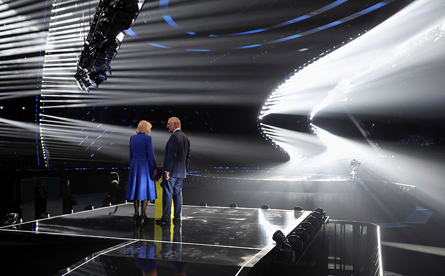 Ο βασιλιάς Κάρολος Γ’ της Βρετανίας, συνοδευόμενος από τη σύζυγό του Καμίλα, έκανε σήμερα τα αποκαλυπτήρια της σκηνής στην M&S Bank Arena του Λίβερπουλ, που θα φιλοξενήσει τον φετινό διαγωνισμό τραγουδιού της Eurovision. Κατόπιν αντίστροφης μέτρησης, το βασιλικό ζεύγος πάτησε ένα μεγάλο ροζ κουμπί και η σκηνή φωταγωγήθηκε, αποκαλύπτοντας ένα εντυπωσιακό σκηνικό.