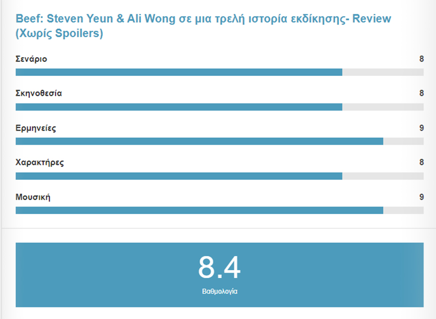 Ο Steven Yeun, αγαπημένος μου από το The Walking Dead αλλά και από την καριέρα που έχτισε μετά από αυτό, έχει εξελιχθεί σε έναν εξαιρετικό ηθοποιό που απογειώνει όποιον ρόλο και αν τον έχω δει. Το Beef δεν είναι εξαίρεση καθώς ως Danny κάνει φοβερή δουλειά. Την Ali Wong από την άλλη την έχω παρακολουθήσει μόνο σε κάποια stand up που έκανε οπότε ήμουν σίγουρος πως μπορούσε να αποδώσει φοβερά το κωμικό κομμάτι έτσι έμεινα έκπληκτος όταν είδα πως απέδωσε εξίσου καλά και τις δραματικές στιγμές του χαρακτήρα της. Πολλά έχουν γραφτεί ήδη για το Beef μερικοί το αποκαλούν μία από τις καλύτερες σειρές του 2023 μέχρι στιγμής, εγώ μπορώ με ευκολία να πω πως σίγουρα είναι μια πραγματικά ιδιαίτερη σειρά. Μπορώ να πω πως έχουμε δει αρκετές σειρές να μεταφέρουν μια ιστορία enemies to lovers ή frenemies να εξελίσσεται αλλά στην περίπτωση του Beef δεν ακολουθούνται τα στερεοτυπικά κλισέ που θα περίμενε κανείς. Αντιθέτως το σενάριο καταφέρνει να δώσει μια πιο ανθρώπινη διάσταση στην παράνοια που επικρατεί και να περάσει τα δικά του μυνήματα.