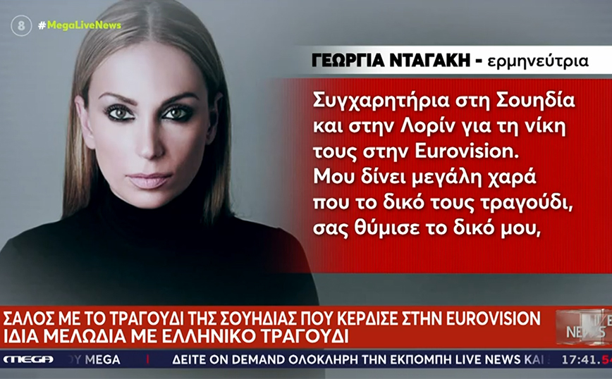 «Συγχαρητήρια στη Σουηδία και στην Λορίν για τη νίκη του στην Eurovision. Μου δίνει μεγάλη χαρά που το δικό τους τραγούδι σας θύμισε το δικό μου ‘’Σκέτος εγώ’’ και που τελικά ήταν και αυτό που ξεχώρισε στον διαγωνισμό» ανέφερε η ερμηνεύτρια, Γεωργία Νταγάκη.