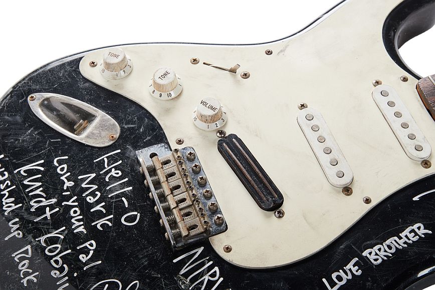 Μια μαύρη ηλεκτρική κιθάρα Fender Stratocaster, που έσπασε ο Kurt Cobain κατά την εποχή του Nevermind των Nirvana πωλήθηκε σε δημοπρασία για 596.000 δολάρια.