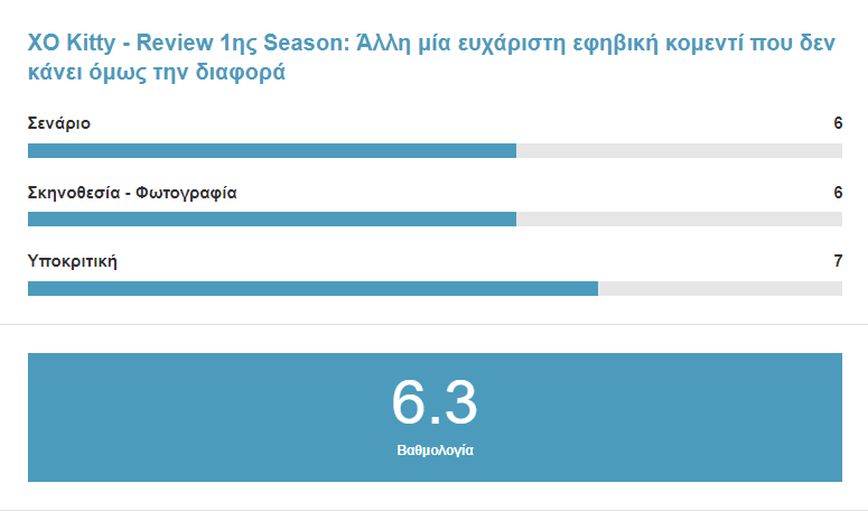 Το «XO, Kitt» ήταν μια ευχάριστη έκπληξη καθώς δείχνει πως πρέπει να είναι ένα εφηβικό δράμα. Αν περιμένετε νεανικά δράματα, αμήχανες σκηνές και λίγο ρομαντισμό, θα τα βρείτε. Η σειρά έχει όλα τα κλισέ των ρομαντικών κωμωδιών, όπως εχθροί που γίνονται εραστές, παρεξηγήσεις, μια ψεύτικη σχέση, ένας καλός φίλος που δίνει καλές συμβουλές και, φυσικά, ένας τρίγωνο αγάπης. Αν είστε fan του είδους ή αν αναζητάτε να δείτε κάτι ευχάριστο και «ελαφρύ» ξεκινήστε το!