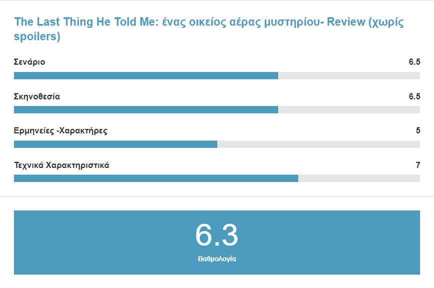 Το The Last Thing He Told Me είναι μια μέτρια δραματική σειρά μυστηρίου που ακολουθεί μια πεπατημένη πλοκή. Οι πρωταγωνίστριες ακολουθούν ασαφείς συνδέσεις και περίεργα στοιχεία καθώς αναζητούν τον Όουεν.