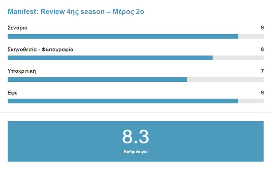 Γενικότερα η σειρά έκανε μια κοιλιά όμως πραγματικά το τελευταίο μισό της 4ης «μύρισε» παλιό καλό Manifest, τόσο με τις εξελίξεις όσο και με τις απρόσμενες αποφάσεις.