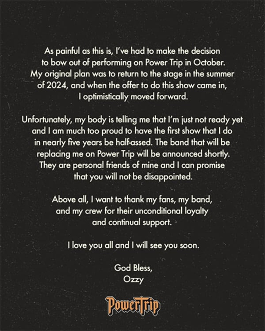 Ο Όζι Όσμπορν (Ozzy Osbourne) σε ανάρτησή του στα μέσα κοινωνικής δικτύωσης ανακοίνωσε ότι δεν θα εμφανιστεί στο «Power Trip Festival» όπως ήταν προγραμματισμένο για τις 7 Οκτωβρίου μαζί με τους AC/DC. Σύμφωνα με το Variety kai όπως αναμεταδίδει το Αθηναϊκό Πρακτορείο Ειδήσεων το φεστιβάλ θα πραγματοποιηθεί στην έδρα του διάσημου Coachella στο Indio της Καλιφόρνια, στις 6, 7 και 8 Οκτωβρίου. Φέτος αναμένεται να εμφανιστούν στην σκηνή του οι Metallica, Guns N’ Roses, AC/DC, Tool και Iron Maiden.