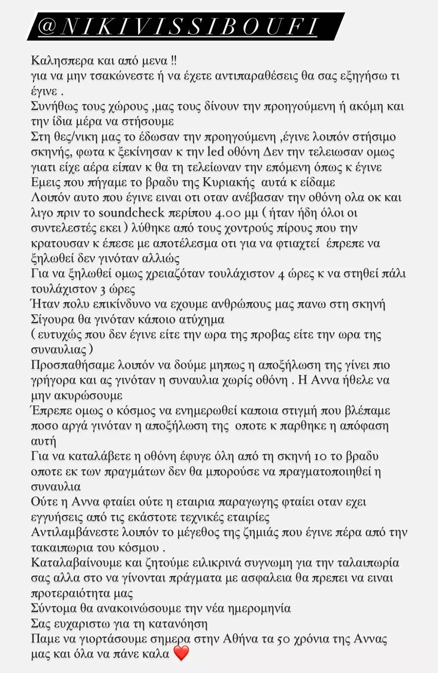 Σύντομα θα ανακοινώσουμε νέα ημερομηνία. Σας ευχαριστώ για την κατανόηση. Πάμε να γιορτάσουμε σήμερα στην Αθήνα τα 50 χρόνια της Άννας μας και όλα να πάνε καλά» έγραψε στην ανάρτησή της η Νίκη Βίσση.