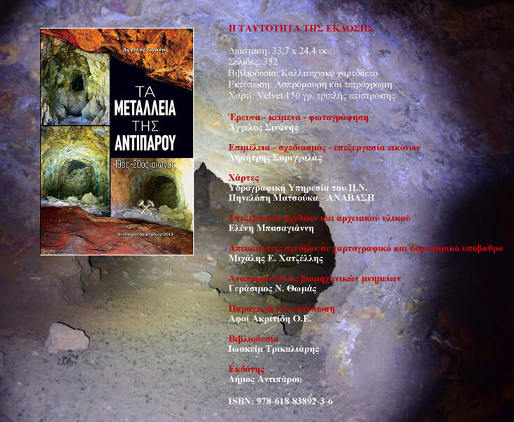 Μετά από πολύχρονη επιτόπια έρευνα κυκλοφορεί ο τόμος Τα Μεταλλεία της Αντιπάρου. Το βιβλίο αναφέρεται στις Κυκλάδες και την Αντίπαρο του 19ου-20ού αιώνα (1830-1955), ειδικότερα στην άγνωστη μεταλλευτική ιστορία τους.