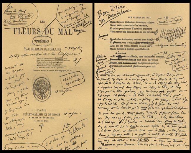 Πρωτοσέλιδο των Άνθεων του Κακού, διορθωμένο από τον ποιητή