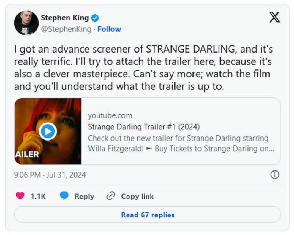 Ο λόγος, φυσικά, για το «Strange Darling» το θρίλερ που έκανε ακόμα και τον μετρ του τρόμου, Στίβεν Κινγκ να δηλώσει εντυπωσιασμένος σε μια δημοσίευσή του στο X (πρώην Twitter).