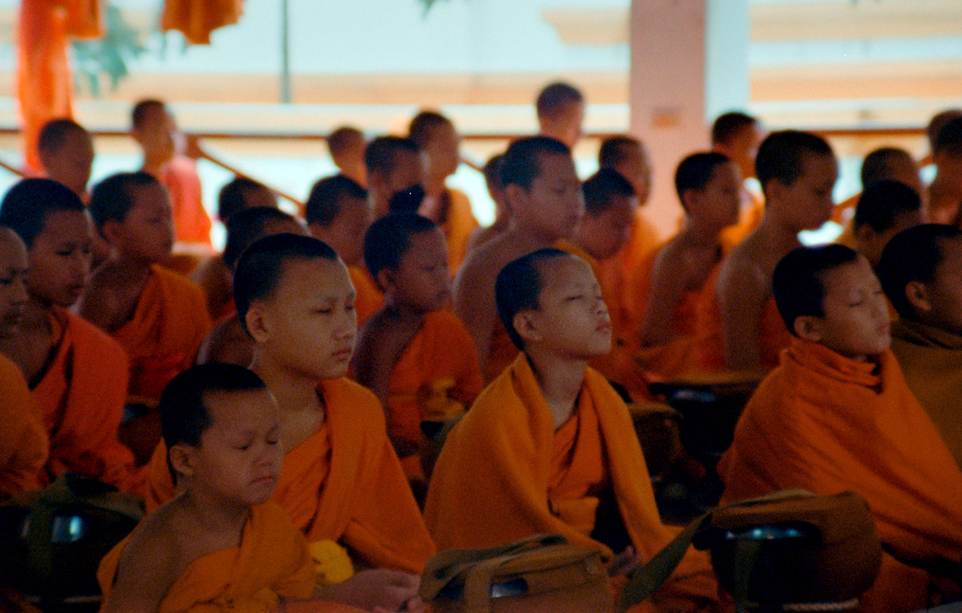 Στο Λάος, το πρώτο μέρος του Samsara, λαμβάνει χώρα σε ένα βουδιστικό μοναστήρι, όπου νεαροί μοναχοί διαλογίζονται για τη ζωή και τον θάνατο. Μέσα από τον διαλογισμό τους, προσκαλούν τους θεατές να ασχοληθούν με τα ορατά και αόρατα στοιχεία της ζωής, υπονοώντας ακόμη και ότι θα μπορούσε κανείς να απολαύσει την ταινία με κλειστά μάτια. Οι νεαροί μαθητεύουν δίπλα σε σοφούς μοναχούς. Ένας από αυτούς διασχίζει κάθε μέρα το ποτάμι για να διαβάσει αποσπάσματα από το Θιβετιανό Βιβλίο των Νεκρών σε μια γυναίκα. Όταν θα έρθει η σειρά της να πεθάνει, το πνεύμα της θα πάρει τον δρόμο για την μετεμψύχωση.