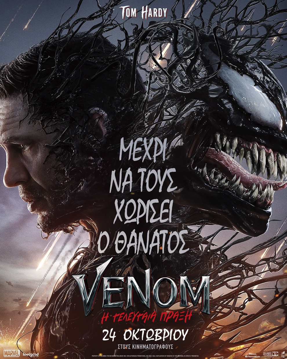 Πρεμιέρα κάνει την Πέμπτη 24 Οκτωβρίου η πολυαναμενόμενη ταινία, «Venom: Η τελευταία πράξη», με τον Τομ Χάρντι να επιστρέφει στον ρόλο του Venom, ενός από τους πιο διάσημους και περίπλοκους χαρακτήρες της Marvel, για το τρίτο και τελευταίο μέρος της τριλογίας. H Kelly Marcel, που συμμετείχε στο σενάριο και την παραγωγή των δύο πρώτων ταινιών, πραγματοποιεί το σκηνοθετικό της ντεμπούτο, σε δικό της σενάριο, βασισμένο σε μια ιστορία που επιμελήθηκε με τον πρωταγωνιστή.