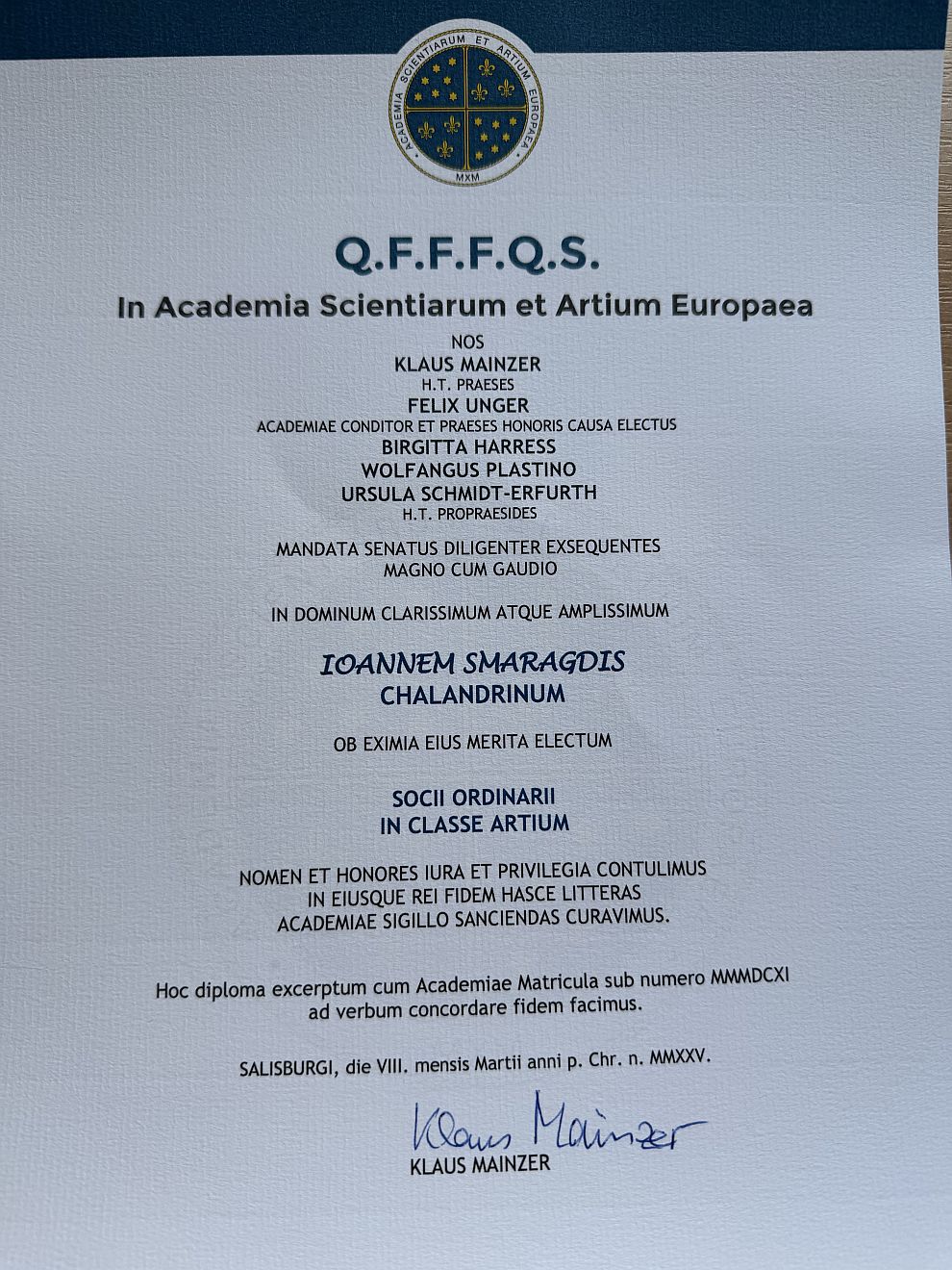 Σε μια λαμπερή τελετή ένταξης, το Σάββατο 8 Μαρτίου στο Σάλτσμπουργκ της Αυστρίας, ο σπουδαίος Γιάννης Σμαραγδής έγινε κι επίσημα τακτικό μέλος της Ευρωπαϊκής Ακαδημίας Επιστημών και Τεχνών, (European Academy of Sciences and Arts) με ομόφωνη απόφαση του Συμβουλίου της. Πρόκειται για τιμητική διάκριση γενικότερης αξίας και ταυτόχρονα επιβράβευση του έλληνα σκηνοθέτη με το βαθύτατο ελληνικό αποτύπωμα σ´ όλο το έργο του επί 40 χρόνια, με αναφορά στις μεγάλες μορφές και αξίες του οικουμενικού Ελληνισμού, των τριών μεγάλων πολιτισμών (Μινωικό, Αρχαίο, Βυζαντινό).