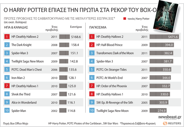 Δεν θα μπορούσε να έχει καλύτερο φινάλε ο πιο διάσημος μάγος αφού το τελευταίο μέρος «Ο Χάρι Πότερ και οι Κλήροι του Θανάτου Μέρος 2ο» είχε μέσα στο πρώτο σαββατοκύριακο προβολής τις μεγαλύτερες εισπράξεις από κάθε άλλη ταινία!