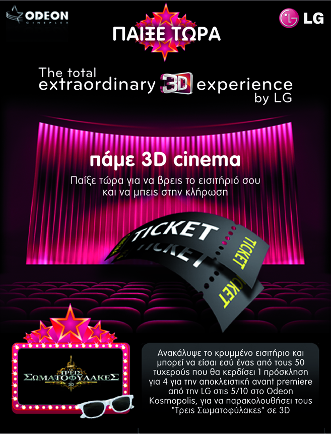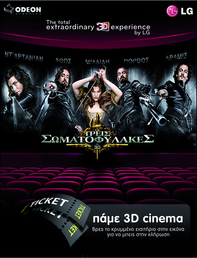 Η LG Electronics, σε συνεργασία με την εταιρεία διανομής Odeon, και στο πλαίσιο της προώθησης της νέας ολοκληρωμένης σειράς προϊόντων 3D, χορηγεί την avant-premiere της νέας τρισδιάστατης ταινίας «Οι Τρεις Σωματοφύλακες».