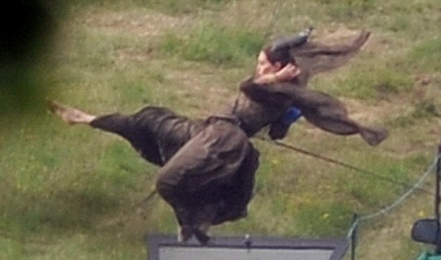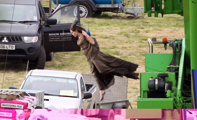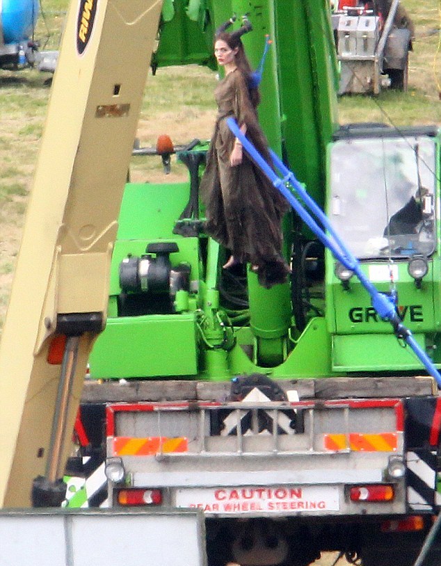 Κρεμασμένη στον αέρα με ειδικά σκοινιά βέβαια να την κρατούν έκανε πως πετάει όπως βέβαια η ιστορία θέλει την Κακιά Μάγισσα της Ωραίας Κοιμωμένης του Disney, αλλιώς Maleficent, όπως είναι και ο τίτλος της ταινίας.