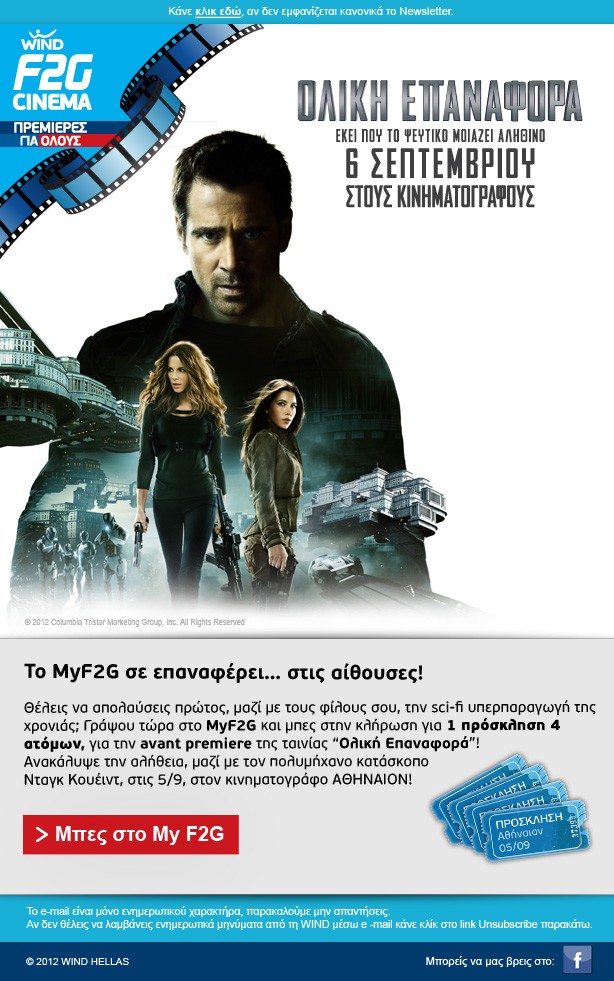 Όσοι θέλουν να απολαύσουν τον Collin Farrel, την Kate Beckinsale και την Jessica Biel να πρωταγωνιστούν στο απόλυτο παιχνίδι φαντασίας και πραγματικότητας χρειάζεται να μπουν στο site του F2G, να εγγραφούν στο Μy F2G και να μπουν στη κλήρωση για 4 προσκλήσεις για την Avant πρεμιέρα της ταινίας.