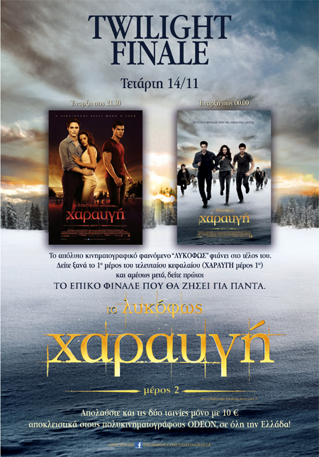 Την Τετάρτη 14 Νοεμβρίου 2012, στις 21.30 θα προβληθεί το 1ο μέρος του τελευταίου κεφαλαίου («Χαραυγή μέρος 1») και αμέσως μετά στις 00.00, δείτε πρώτοι το επικό φινάλε που θα ζήσει για πάντα… «Το Λυκόφως Χαραυγή μέρος 2» Απολαύστε και τις δύο ταινίες μόνο με 10 ευρώ αποκλειστικά στους κινηματογάφους Οdeon, σε όλη την Ελλάδα!