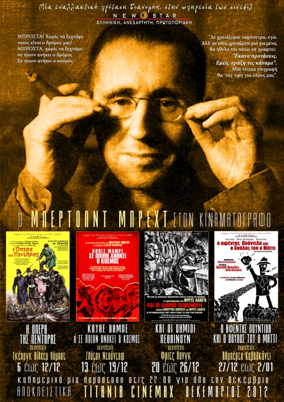 Ένα αφιέρωμα στον κορυφαίο θεατρικό συγγραφέα Μπέρτολτ Μπρεχτ διοργανώνεται από τη NEW STAR, με την προβολή κινηματογραφικών ταινιών βασισμένων στο έργο του Γερμανού, αλλά και κινηματογραφημένες θεατρικές παραστάσεις.